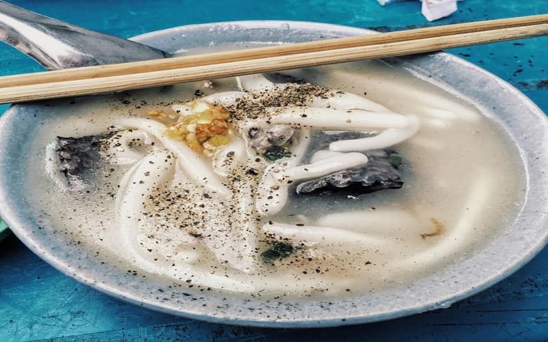 Nước dùng thường được nấu từ xương heo hoặc vịt, kết hợp với nước cốt dừa tạo nên vị béo đặc trưng. Khi ăn, người ta thường thêm chút tiêu, hành lá và ớt để tăng hương vị. Đây là món ăn đơn giản nhưng lại khiến nhiều người nhớ mãi.